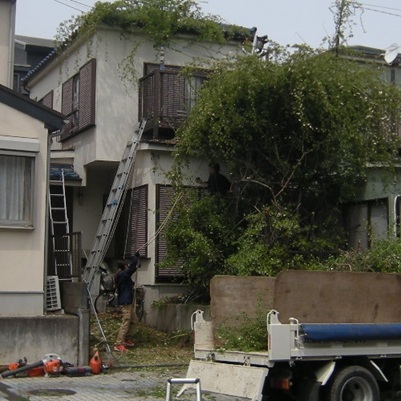 2階の屋根まで伸びたモッコウバラの伐採を承りました。